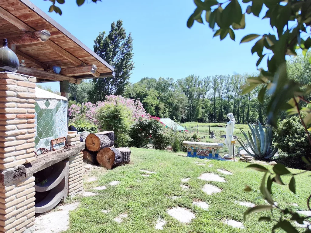 Gli ampi spazi esterni della villa vi permettono di rilassarvi nel giardino pittoresco tra sculture, panchine colorate e giochi per bambini. I più piccoli adoreranno altalena, dondolo, scivoli e palline, così come osservare gli animali della piccola fattoria: galline, oche e caprette.