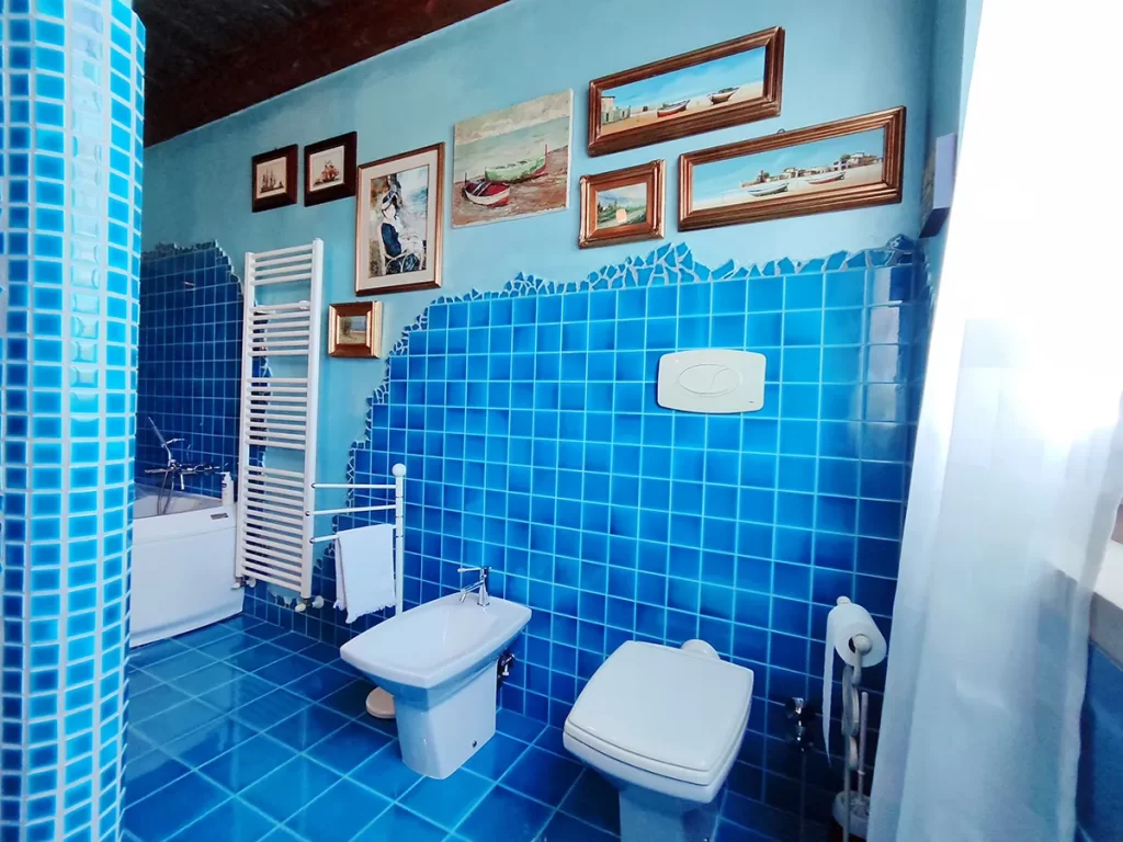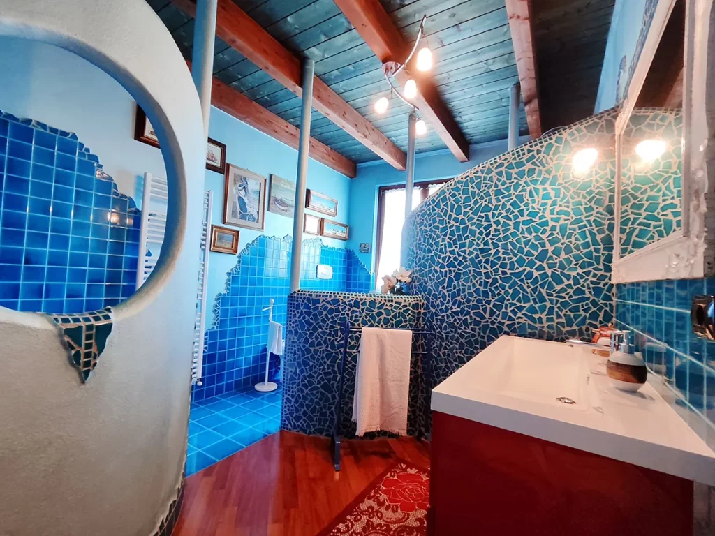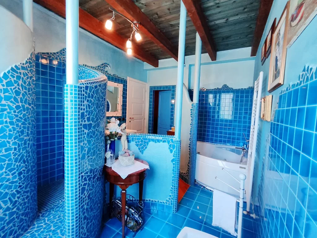 Il bagno, a uso esclusivo degli ospiti, è una delle opere artigianali realizzate dal proprietario: una vera e propria mini SPA privata con doccia e vasca idromassaggio, dove rilassarsi tra le onde azzurre delle decorazioni marine.